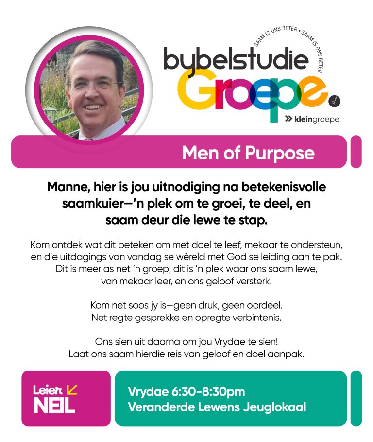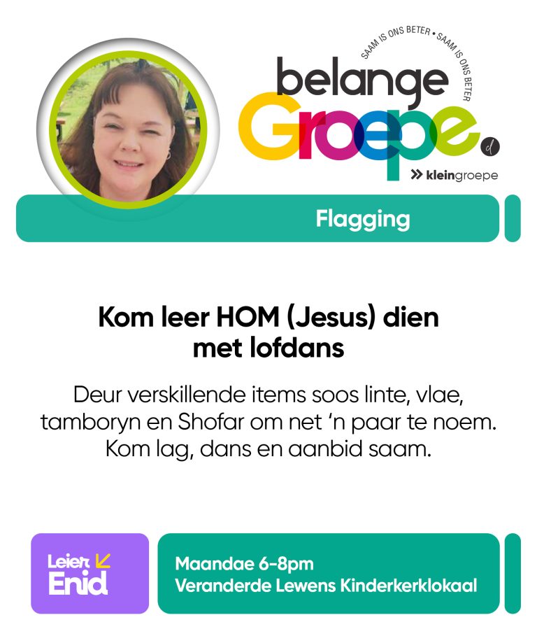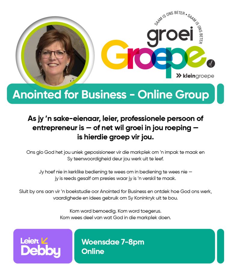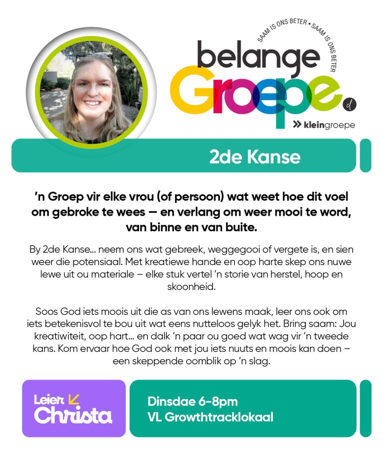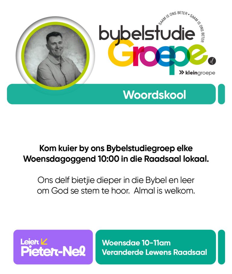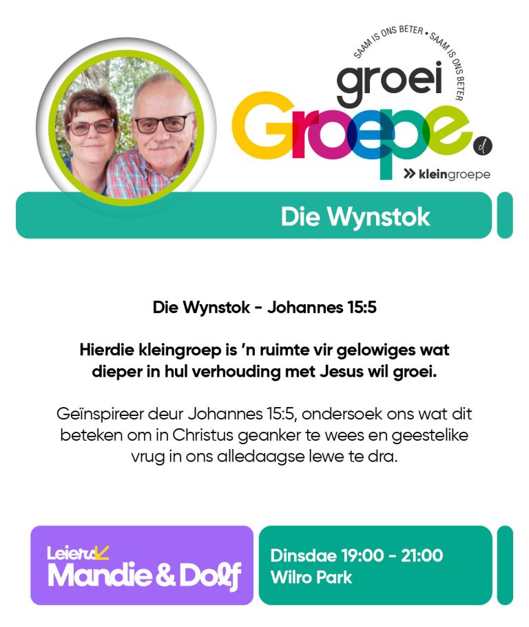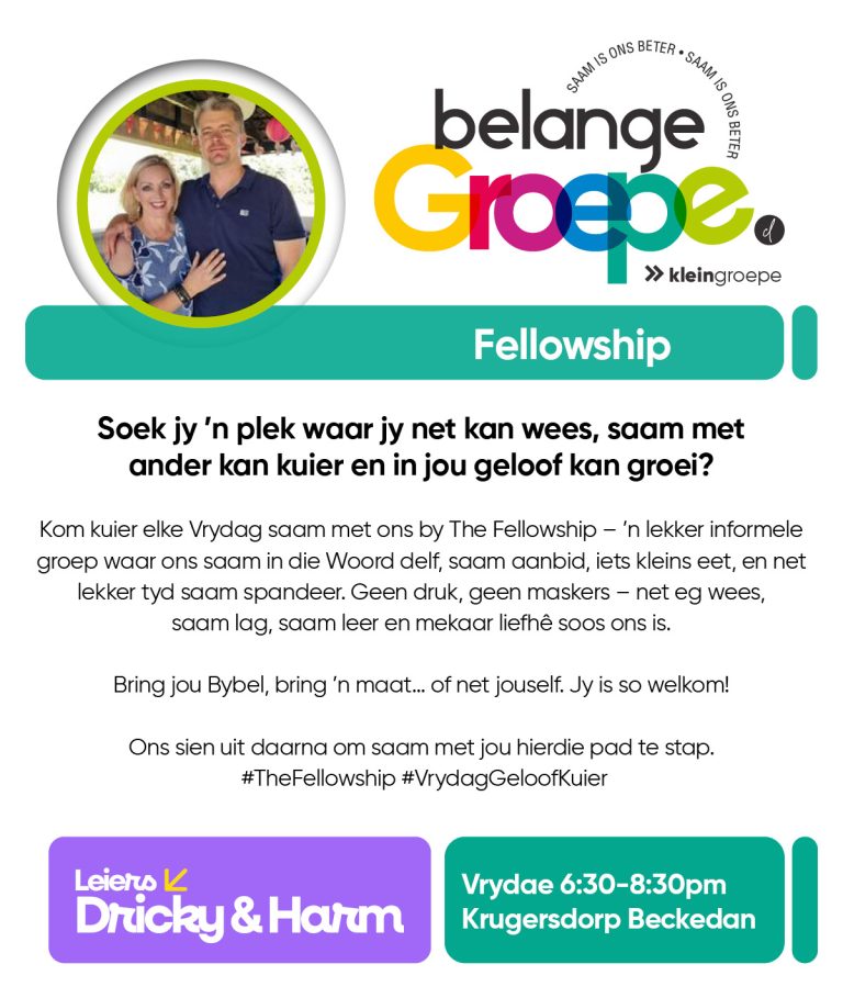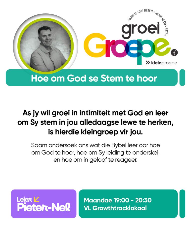 As jy nog nie in ‘n Kleingroep is nie, hoekom sluit jy nie vandag by ‘n Kleingroep aan nie? Sien hieronder van ons Kleingroepe vir hierdie kwartaal, kontak gerus die kleingroepleier van die groep waarby jy graag wil aansluit.