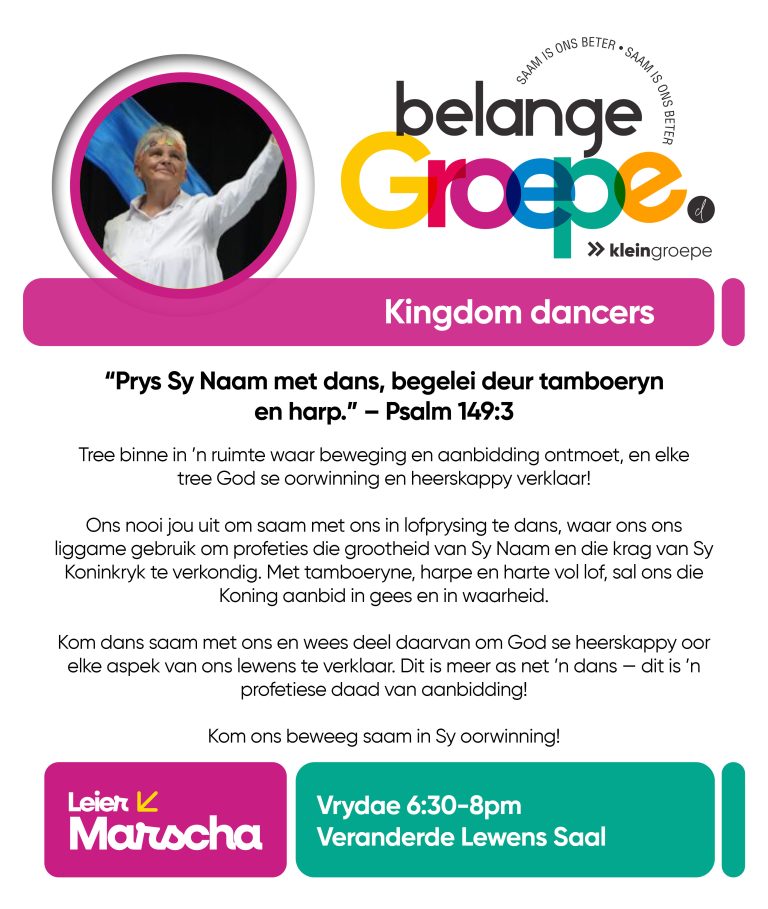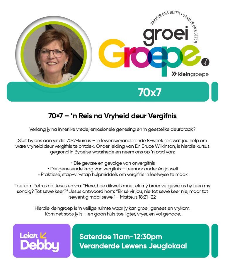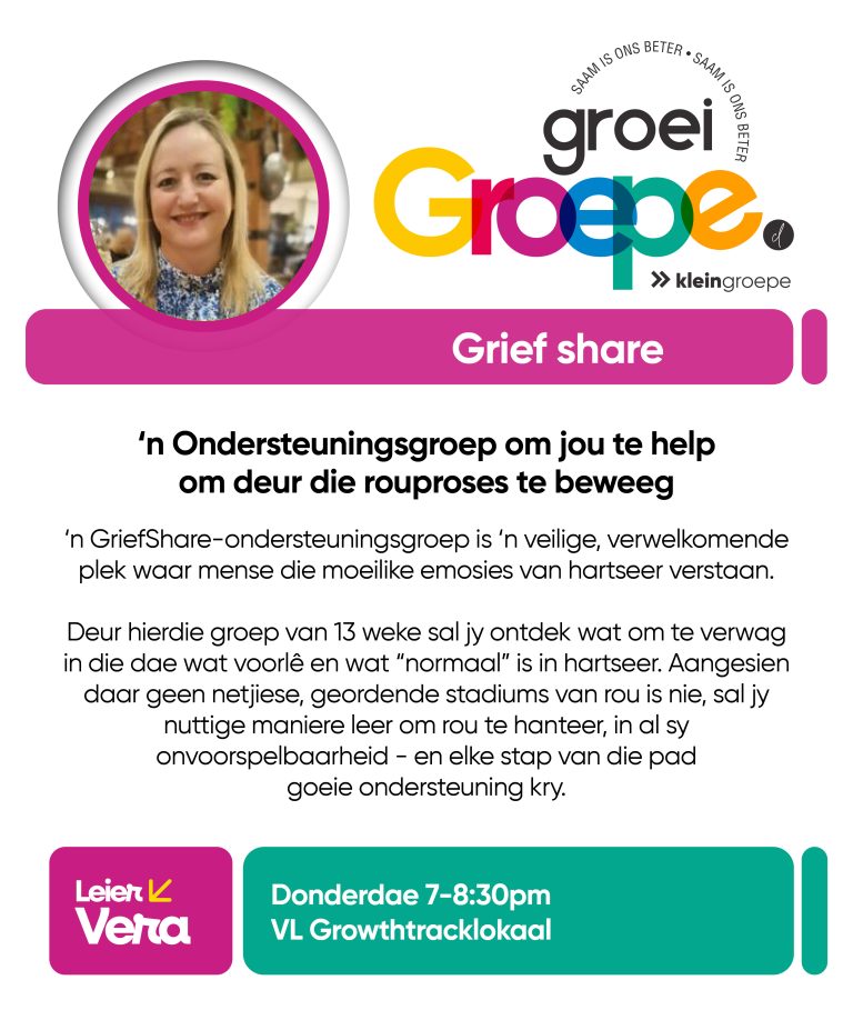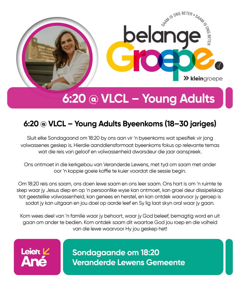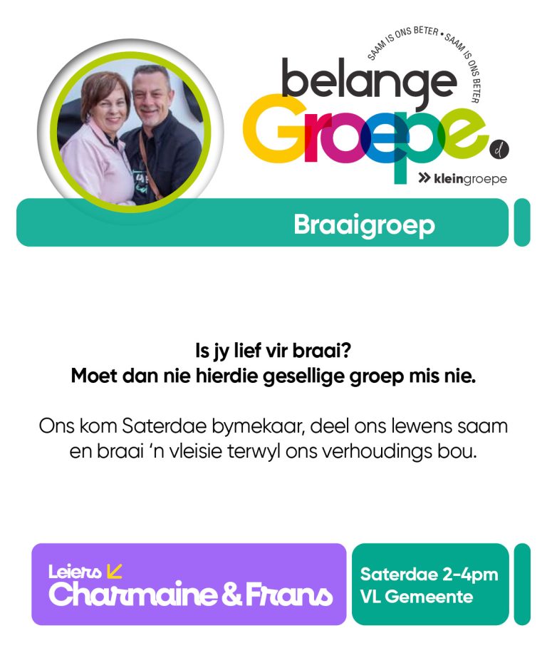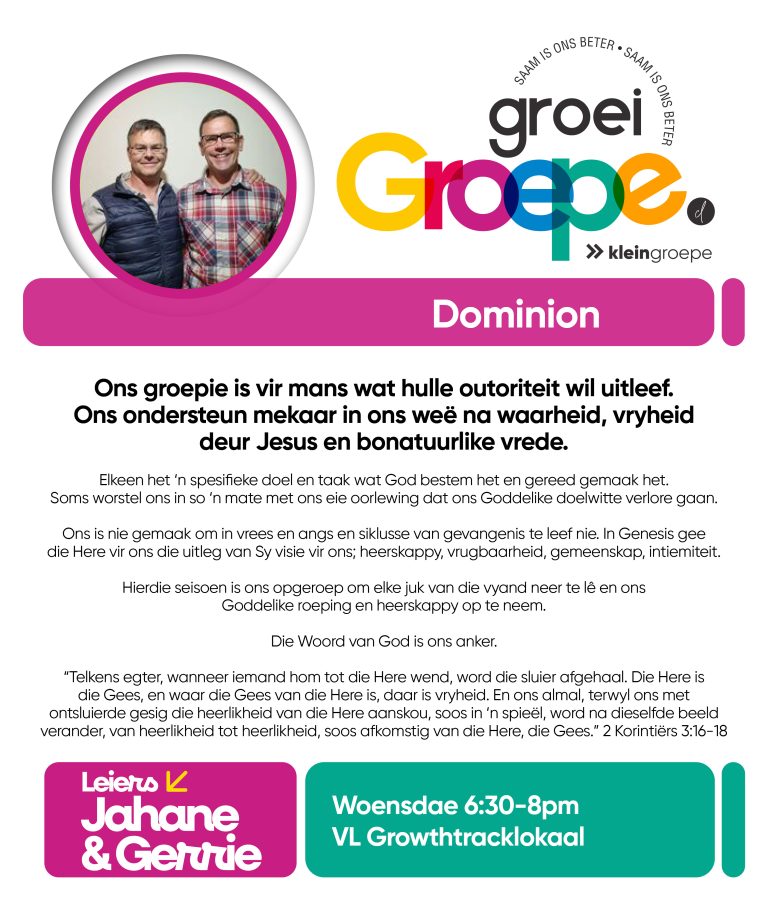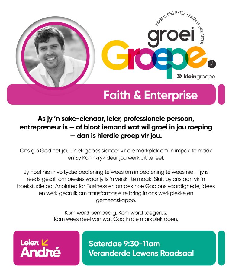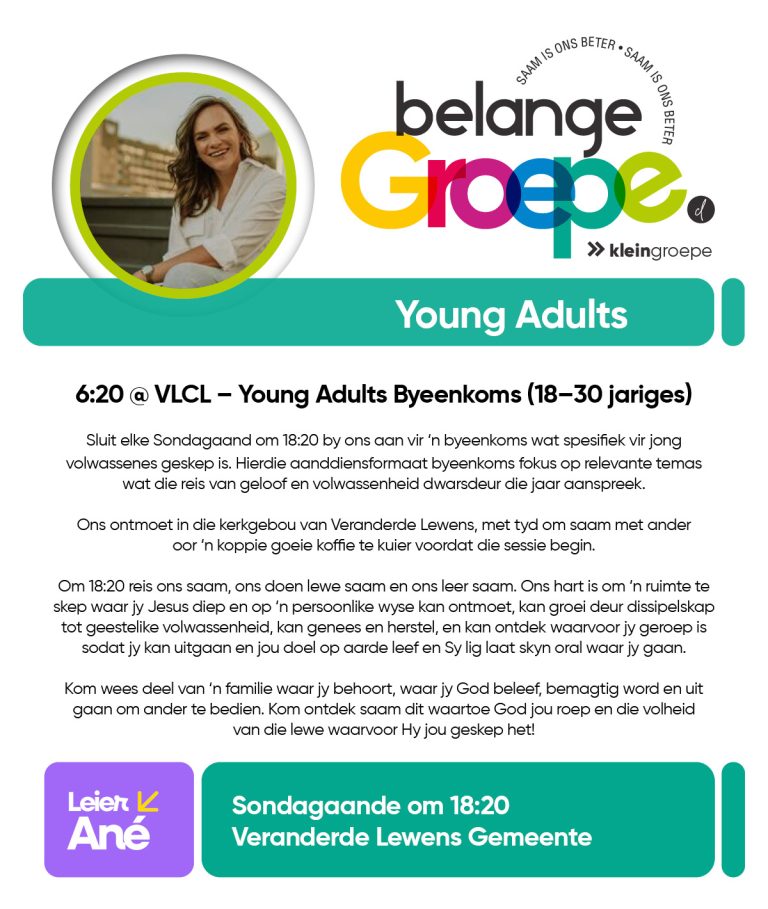 As jy nog nie in ‘n Kleingroep is nie, hoekom sluit jy nie vandag by ‘n Kleingroep aan nie? Sien hieronder van ons Kleingroepe vir hierdie kwartaal, kontak gerus die kleingroepleier van die groep waarby jy graag wil aansluit.