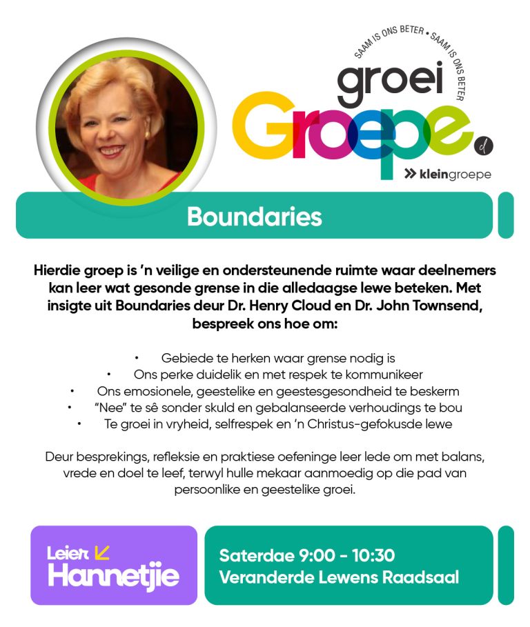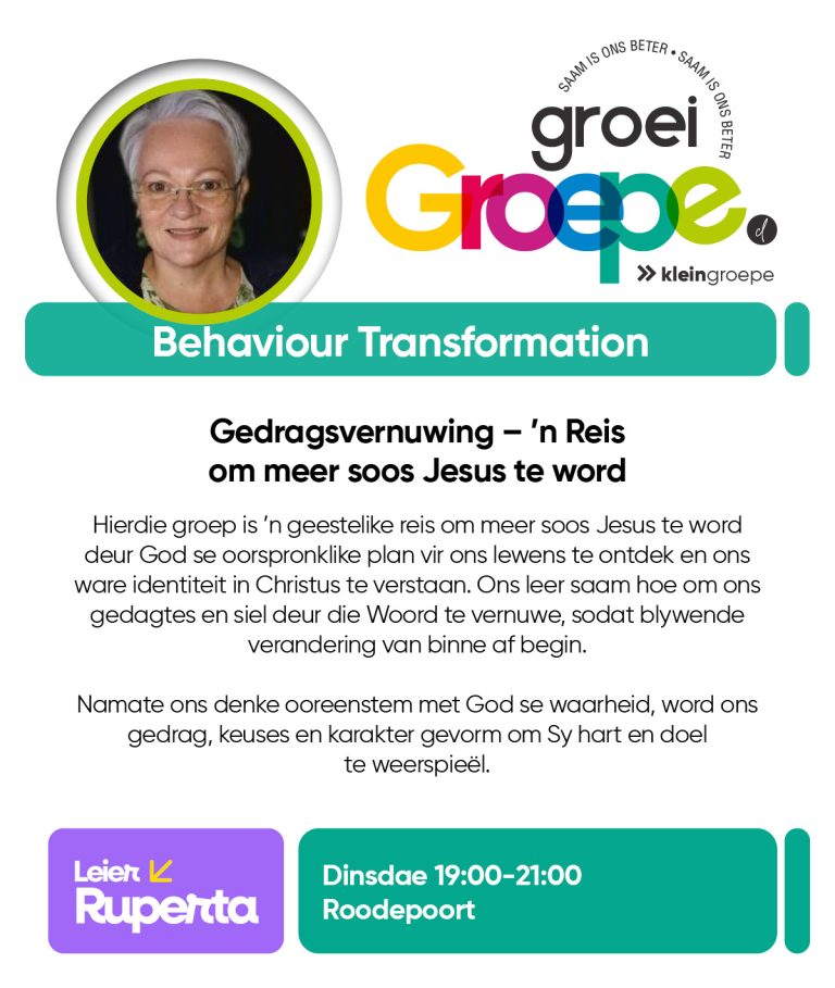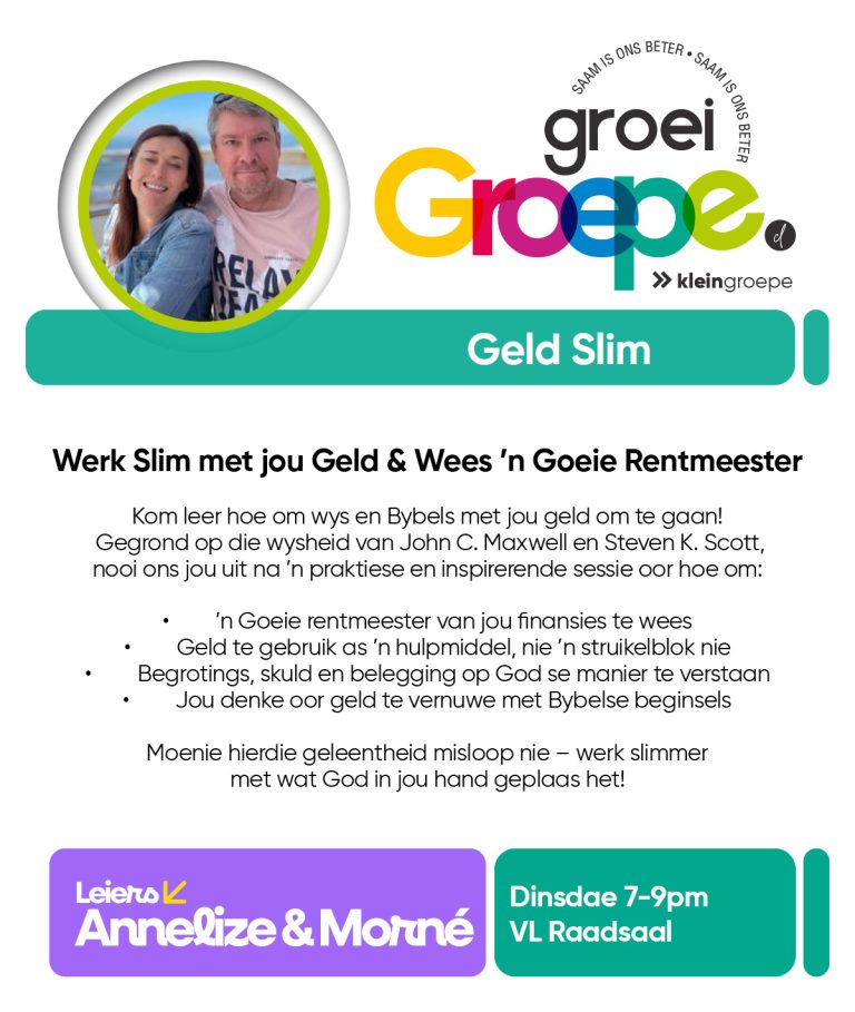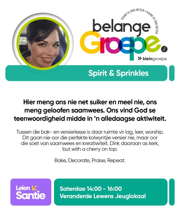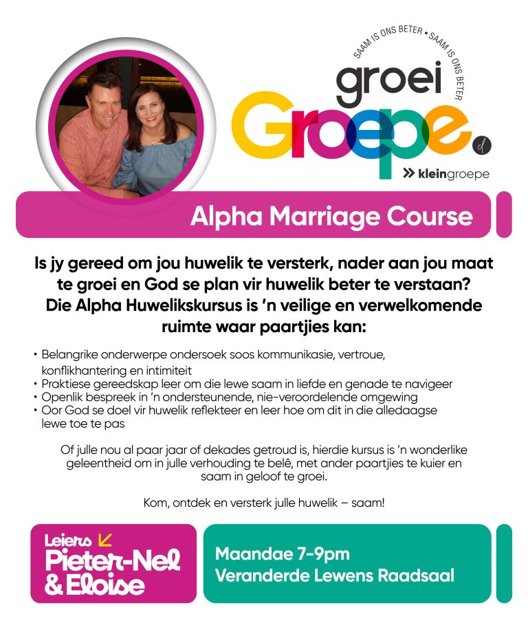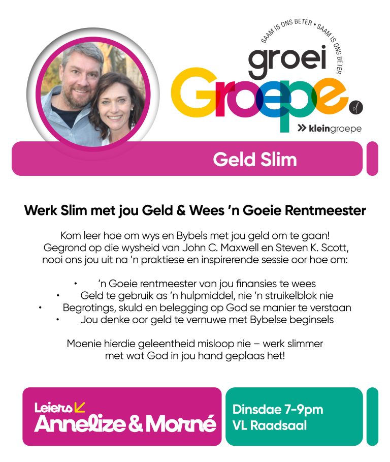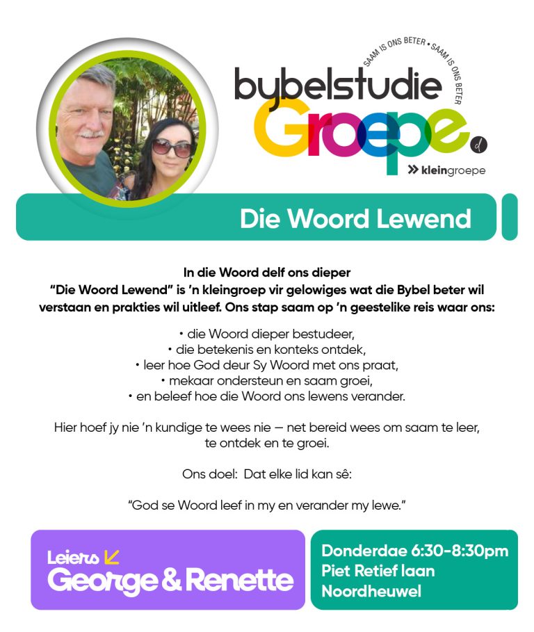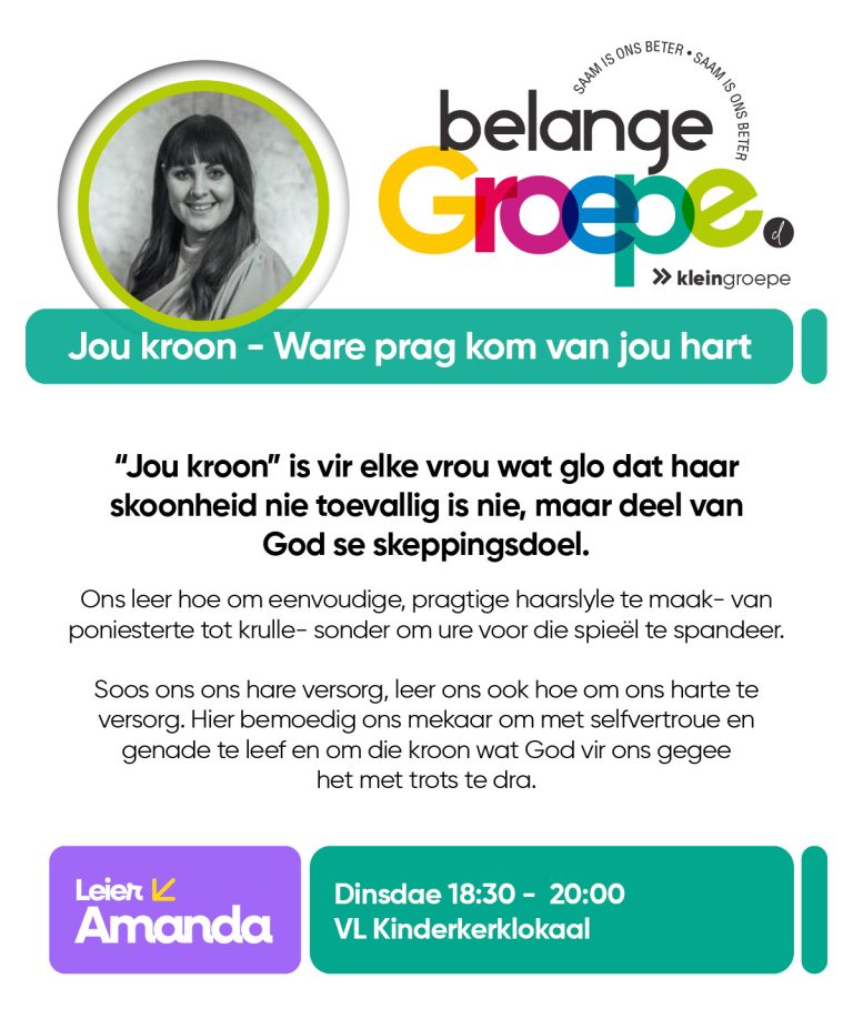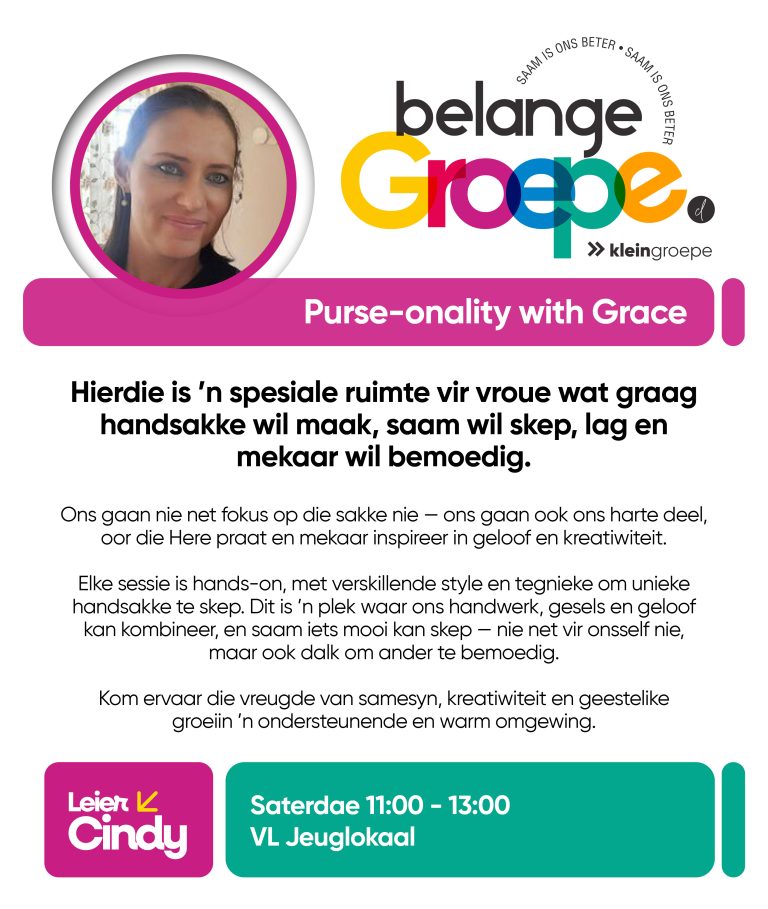 As jy nog nie in ‘n Kleingroep is nie, hoekom sluit jy nie vandag by ‘n Kleingroep aan nie? Sien hieronder van ons Kleingroepe vir hierdie kwartaal, kontak gerus die kleingroepleier van die groep waarby jy graag wil aansluit.