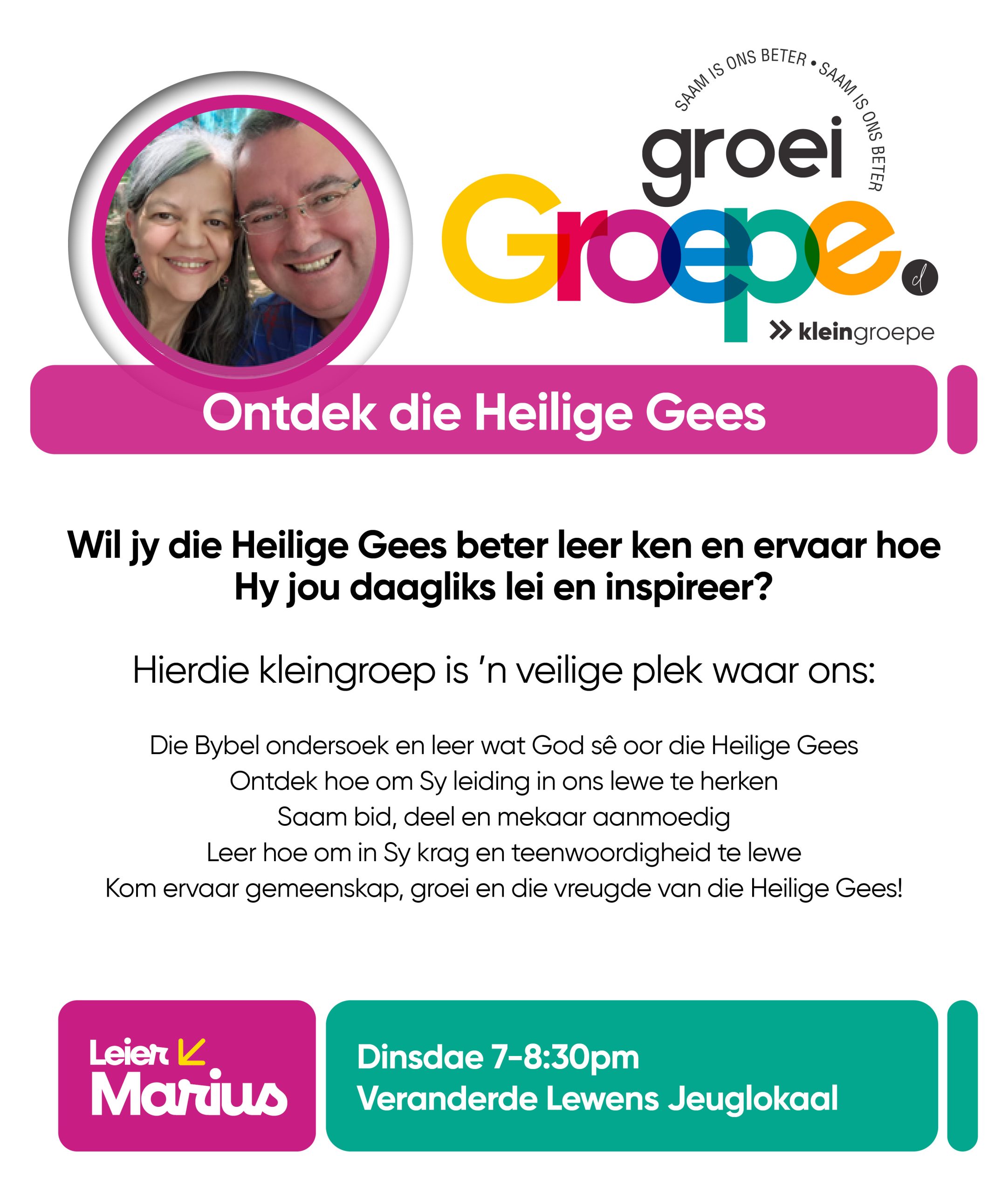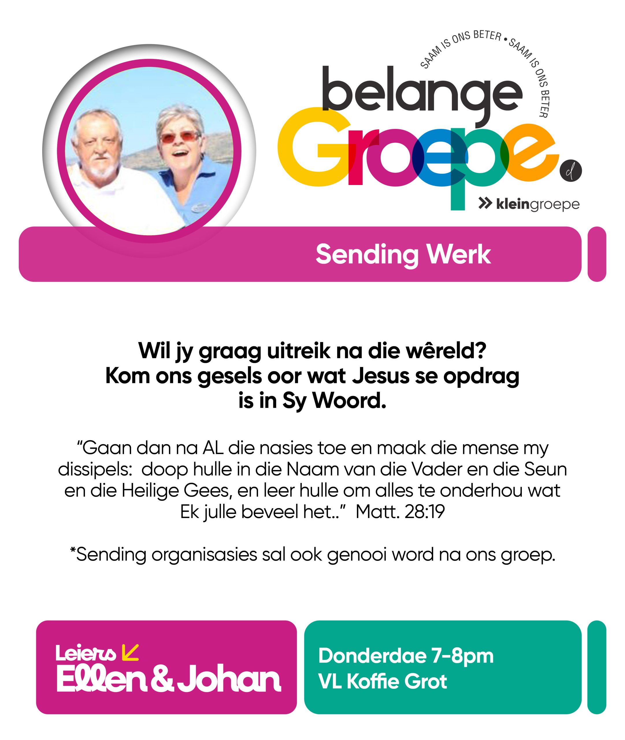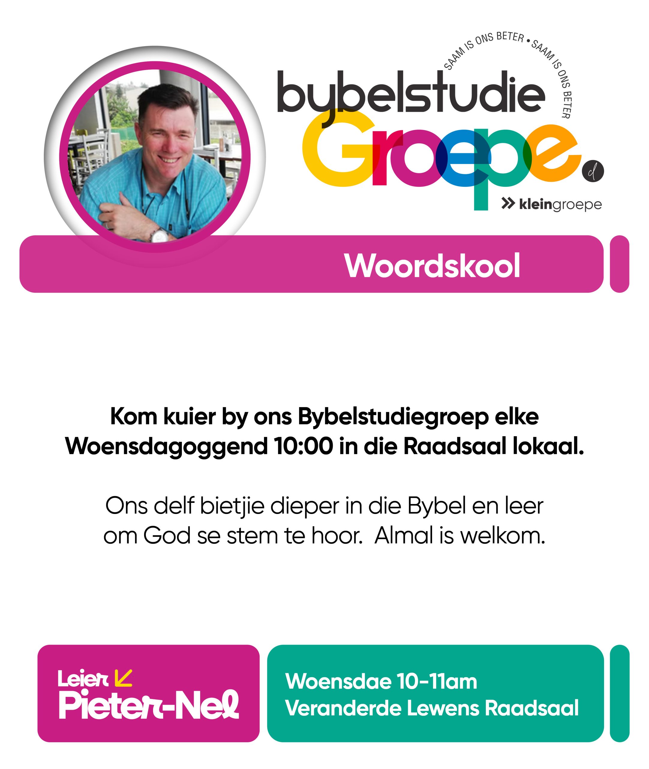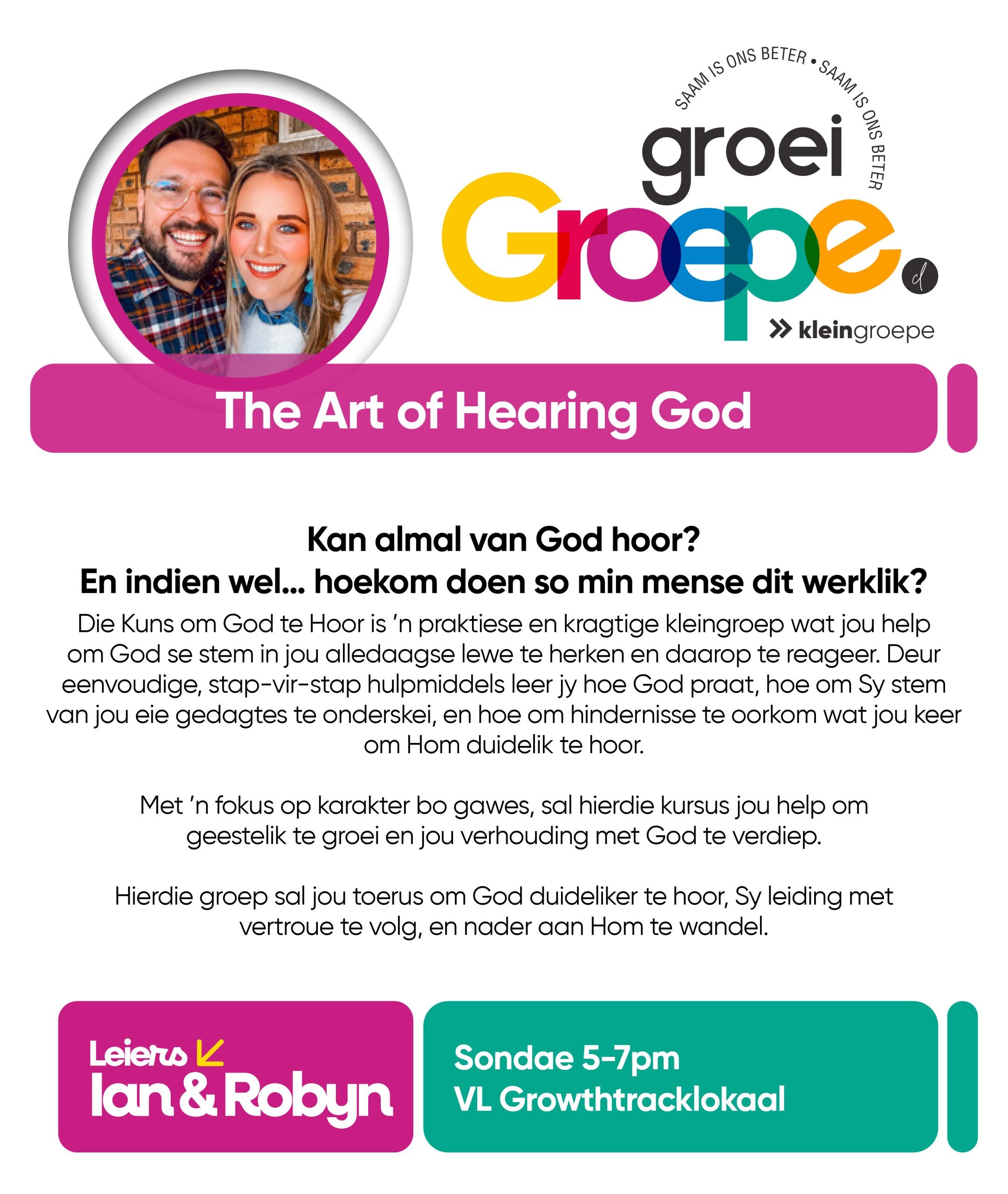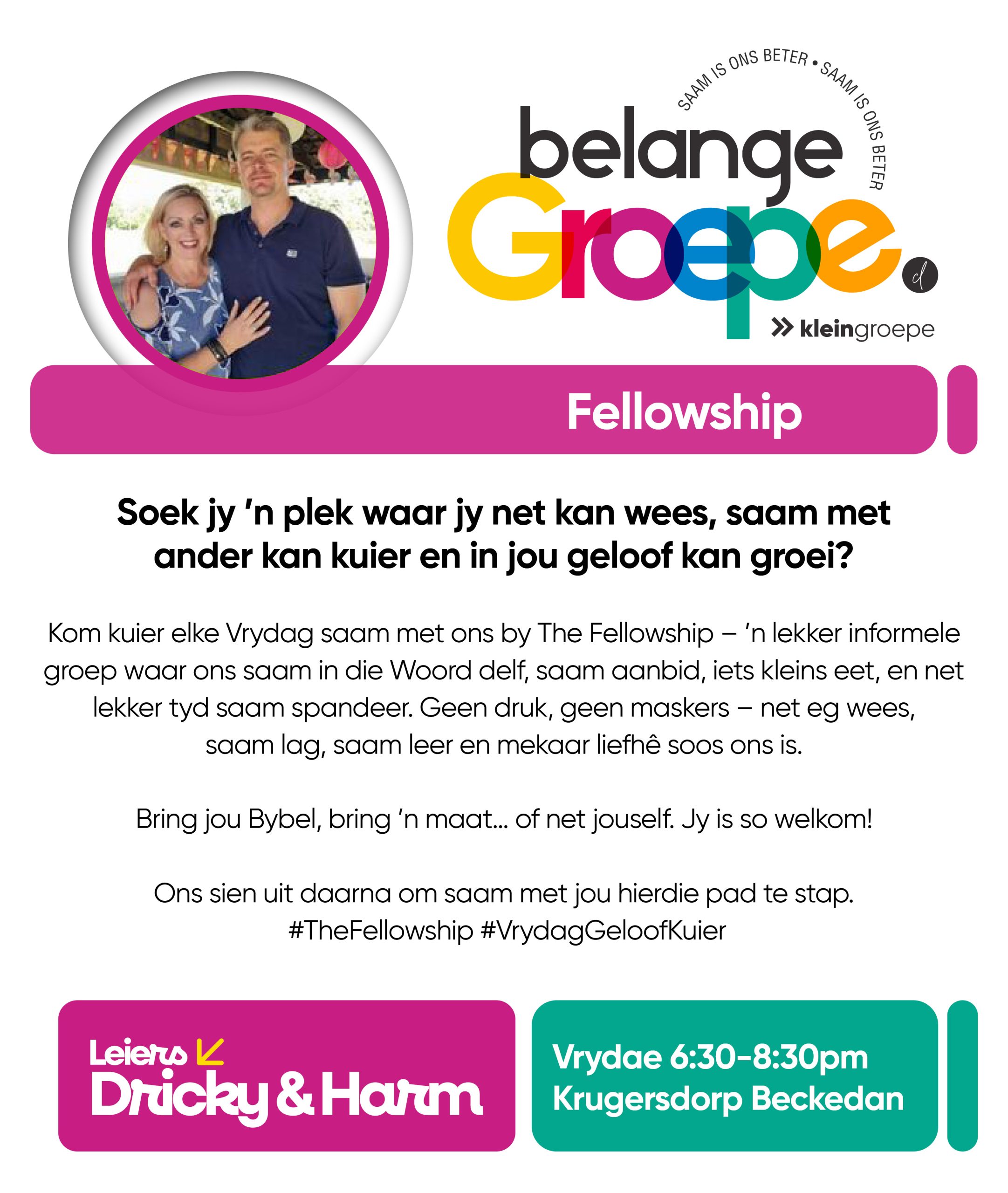 As jy nog nie in ‘n Kleingroep is nie, hoekom sluit jy nie vandag by ‘n Kleingroep aan nie? Sien hieronder van ons Kleingroepe vir hierdie kwartaal, kontak gerus die kleingroepleier van die groep waarby jy graag wil aansluit.