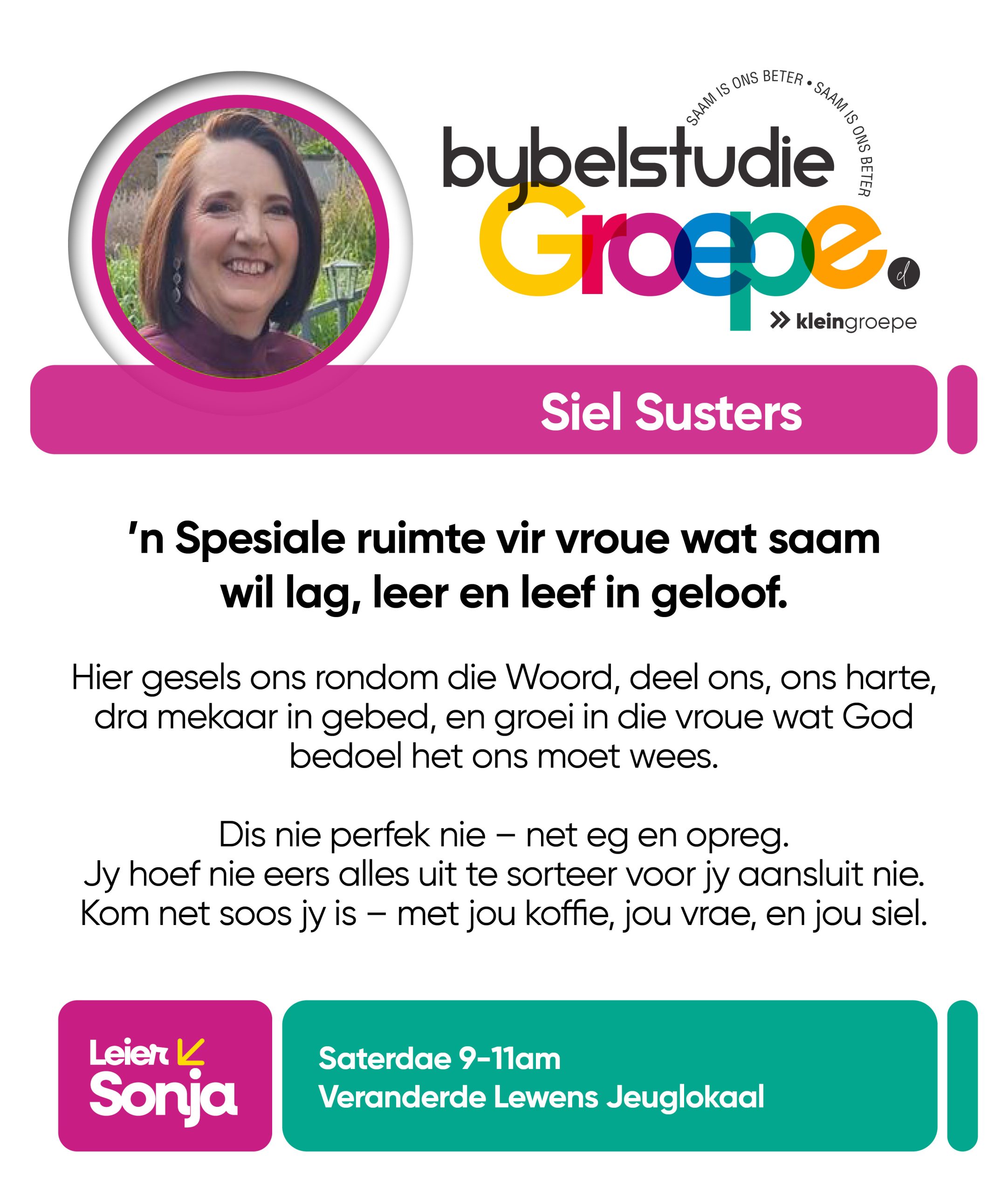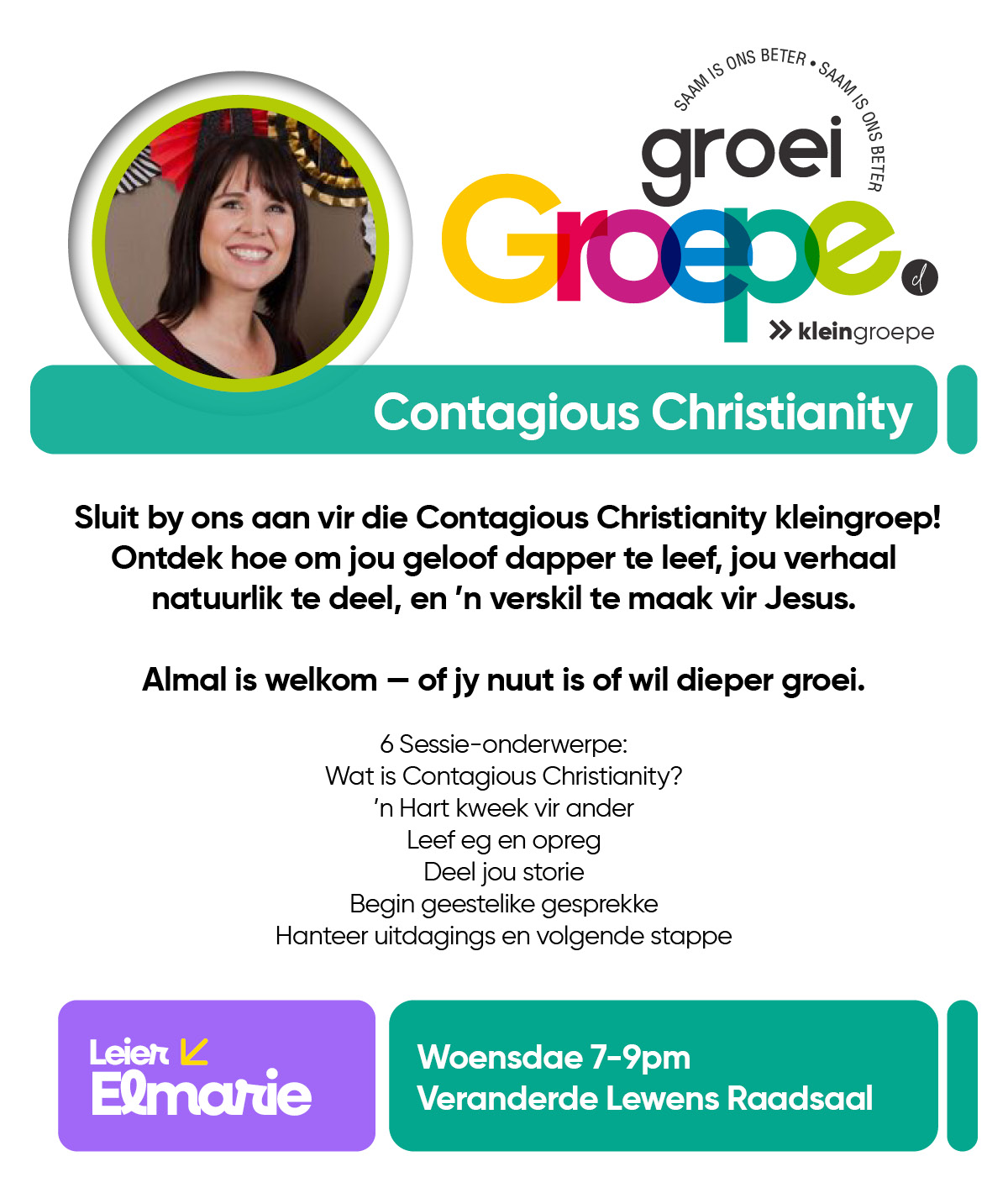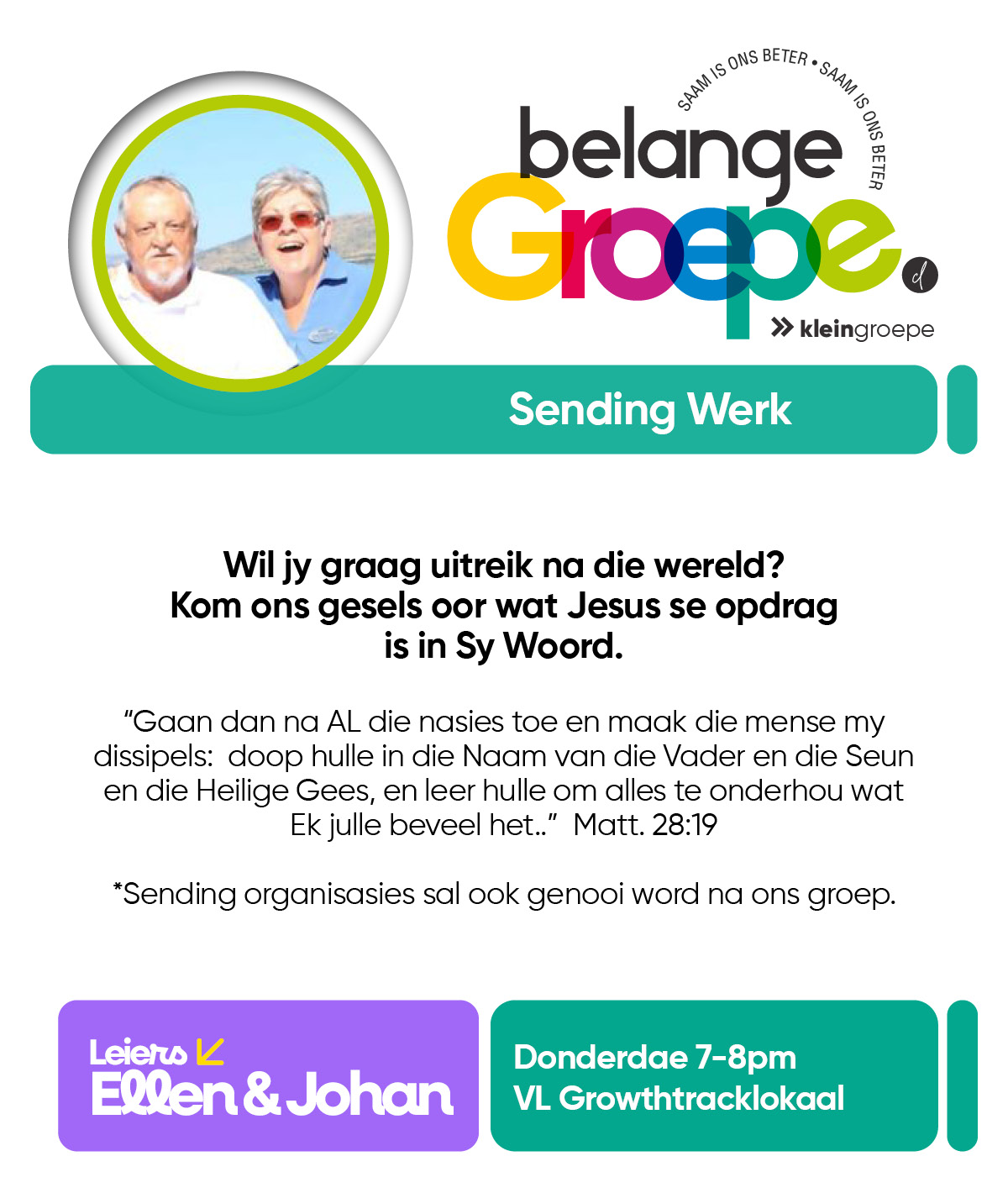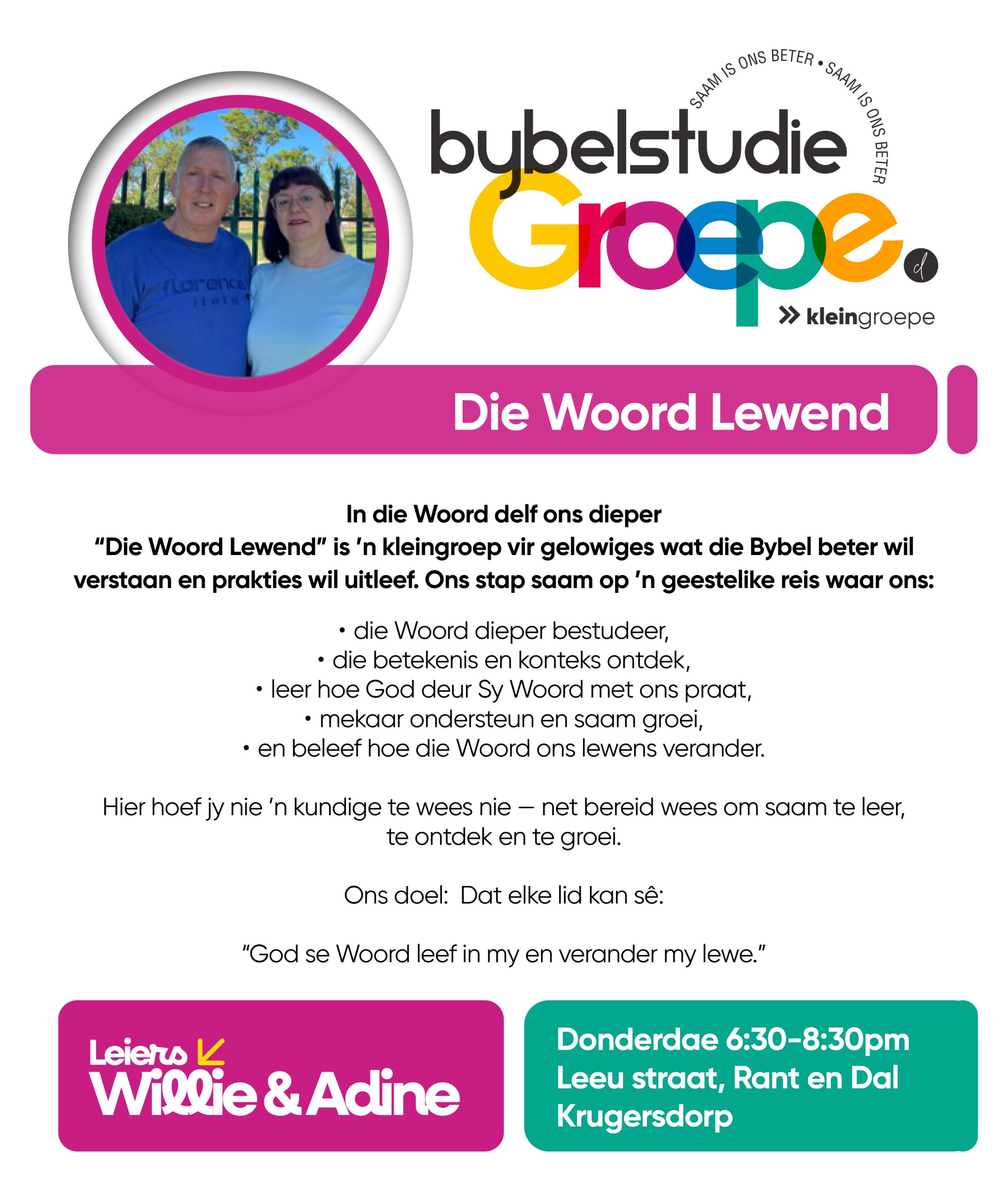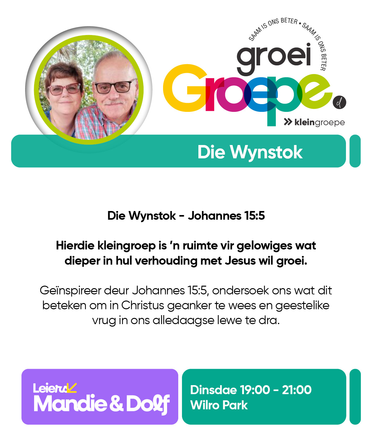 As jy nog nie in ‘n Kleingroep is nie, hoekom sluit jy nie vandag by ‘n Kleingroep aan nie? Sien hieronder van ons Kleingroepe vir hierdie kwartaal, kontak gerus die kleingroepleier van die groep waarby jy graag wil aansluit.