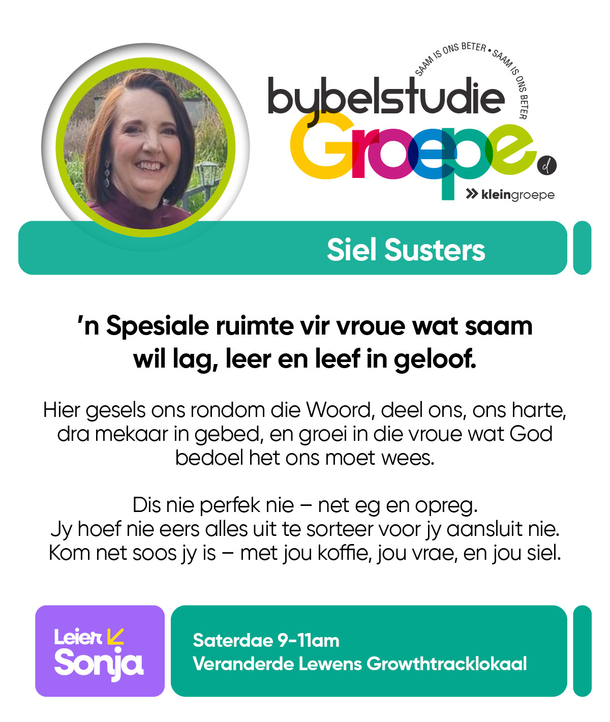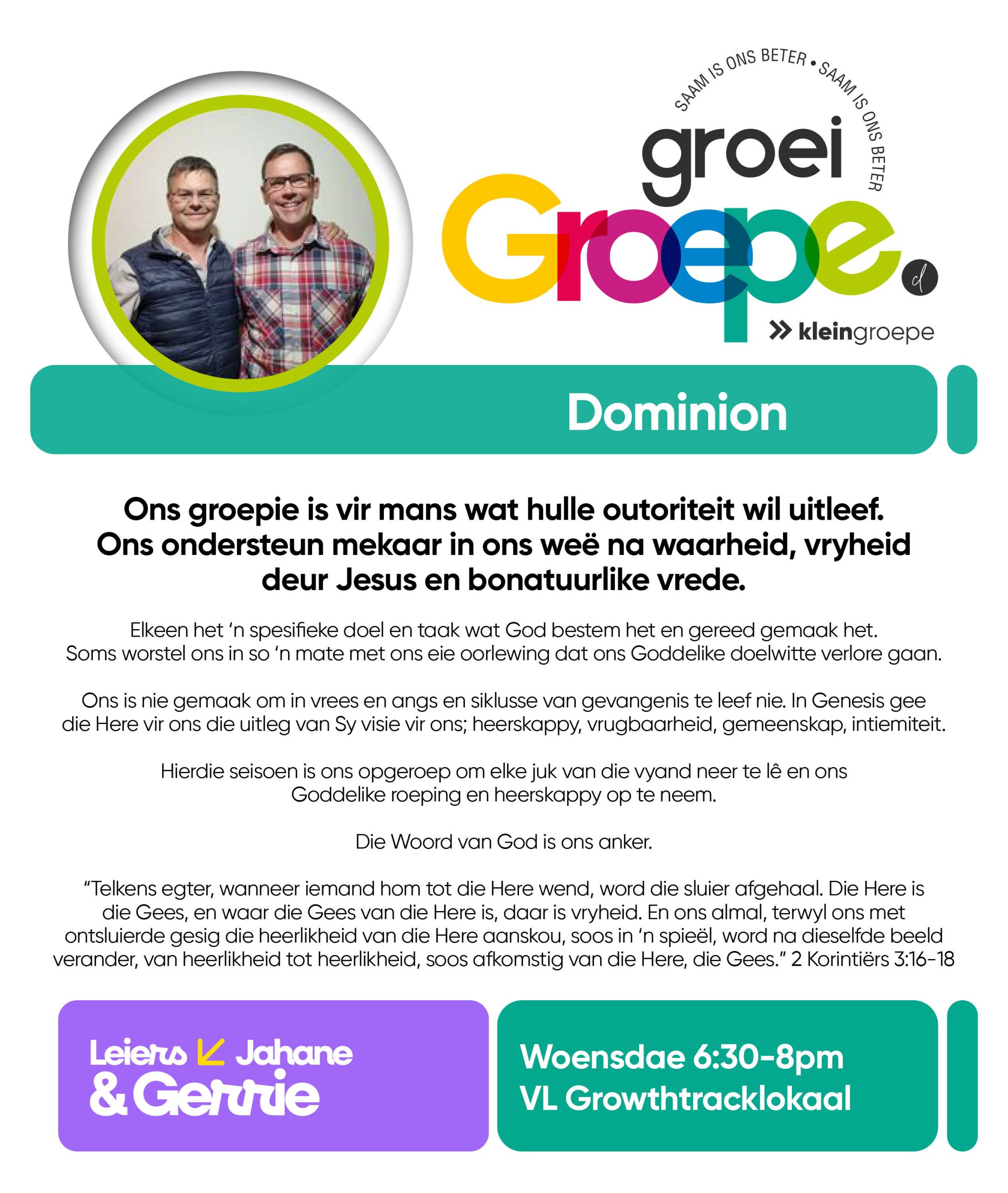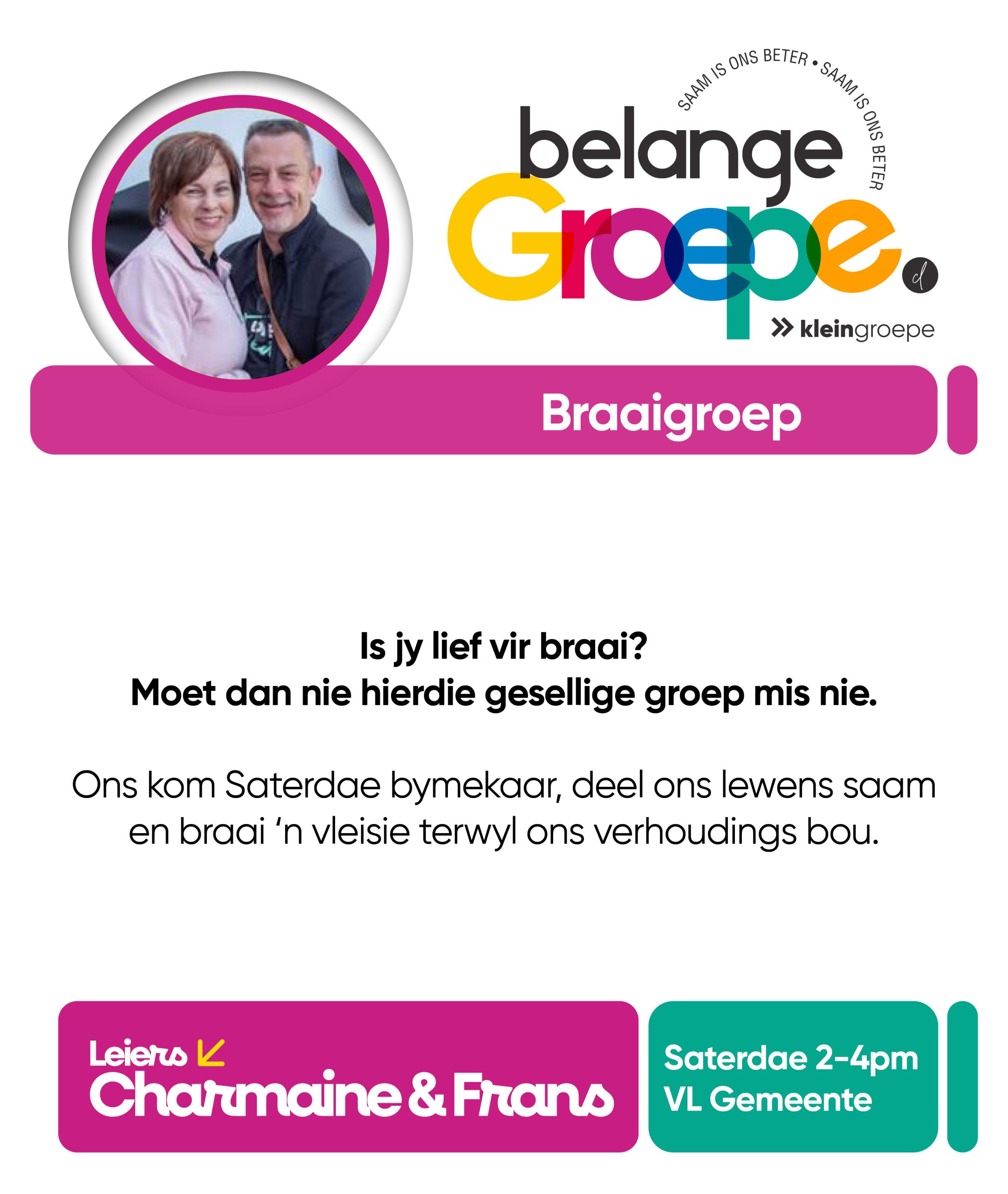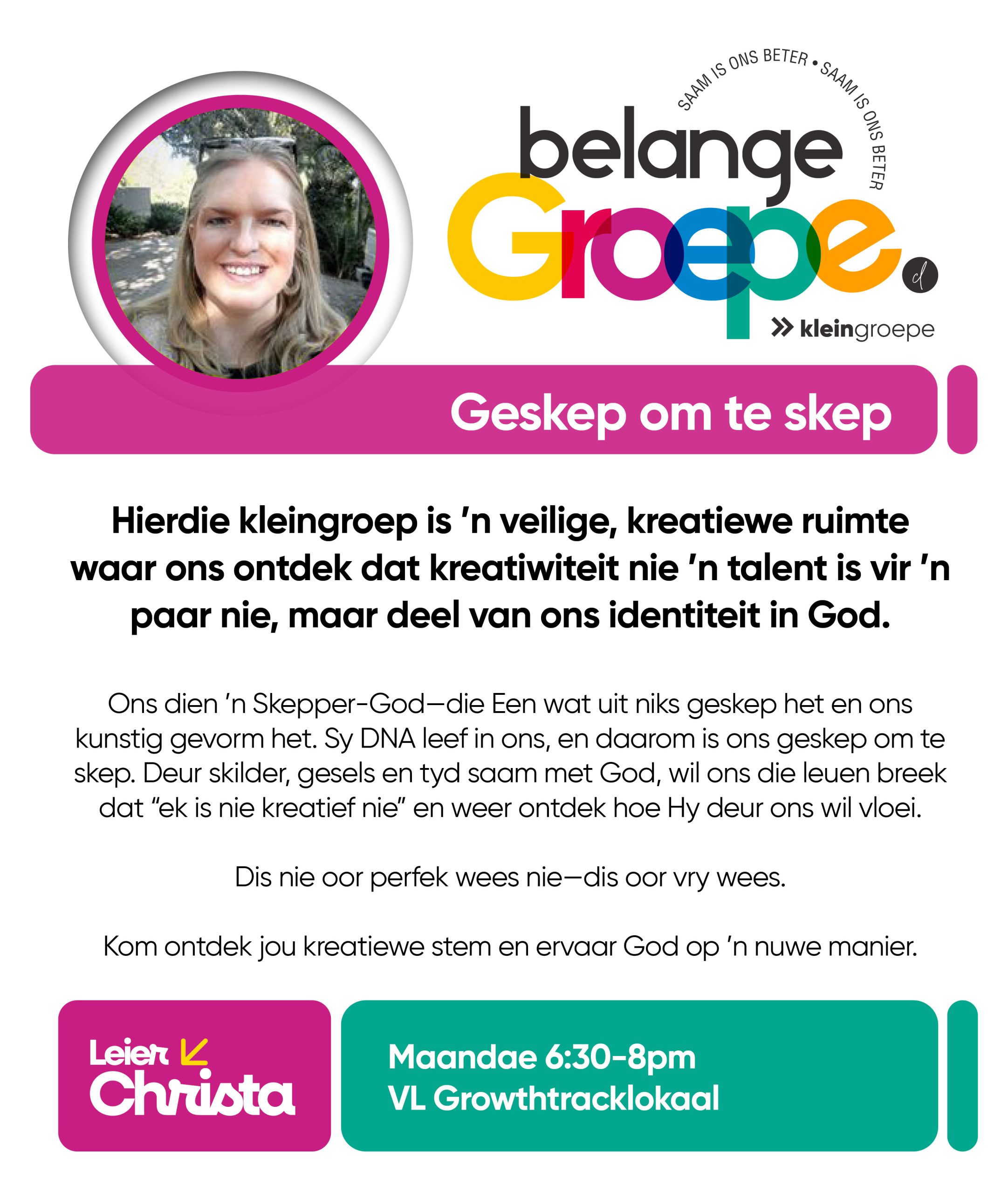 As jy nog nie in ‘n Kleingroep is nie, hoekom sluit jy nie vandag by ‘n Kleingroep aan nie? Sien hieronder van ons Kleingroepe vir hierdie kwartaal, kontak gerus die kleingroepleier van die groep waarby jy graag wil aansluit.